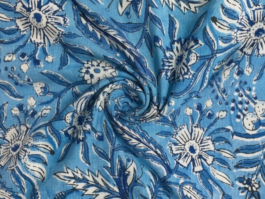 【50cm単位】ブロックプリント生地 インド綿 花柄 ブルーフローラルガーデン